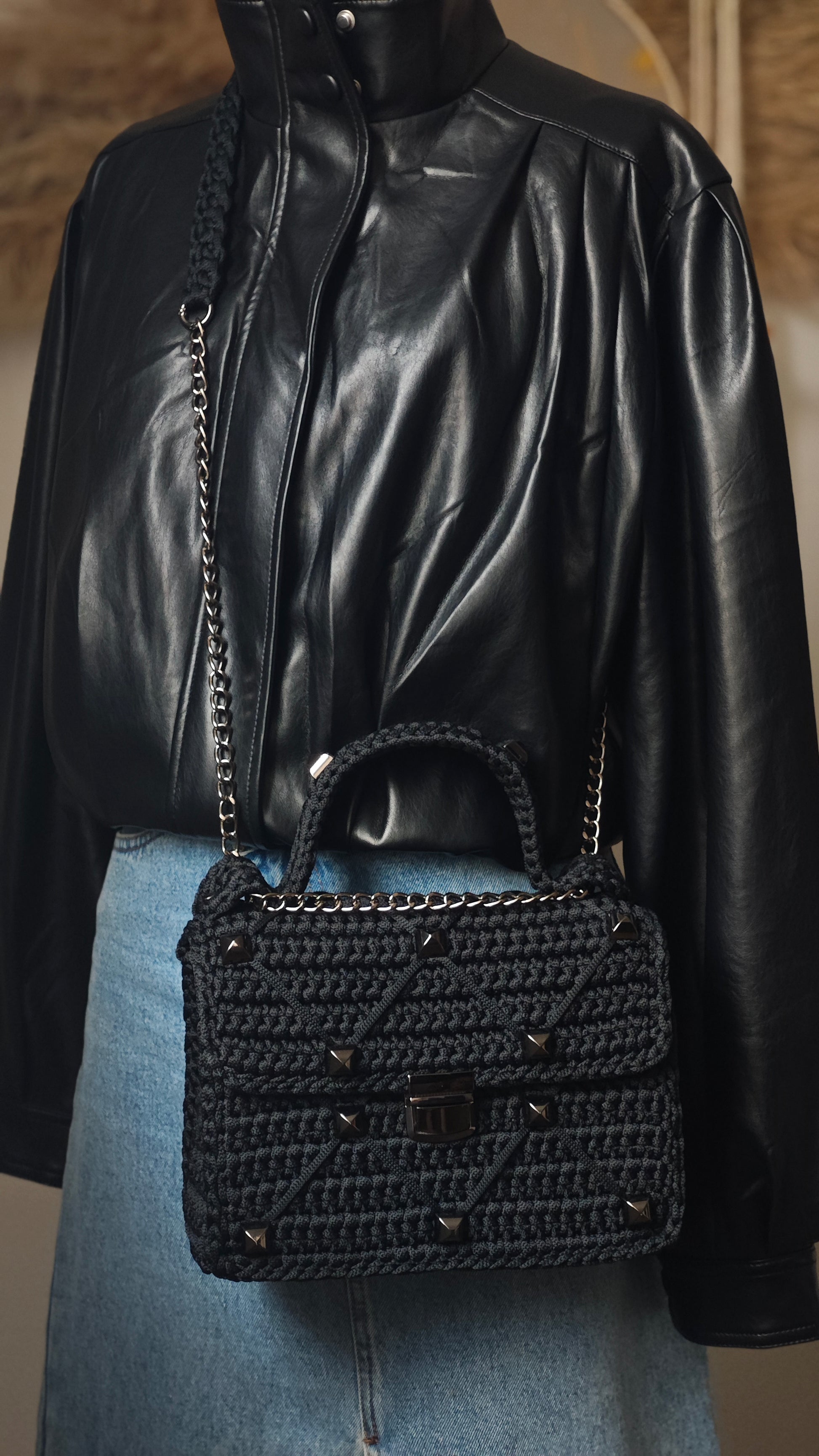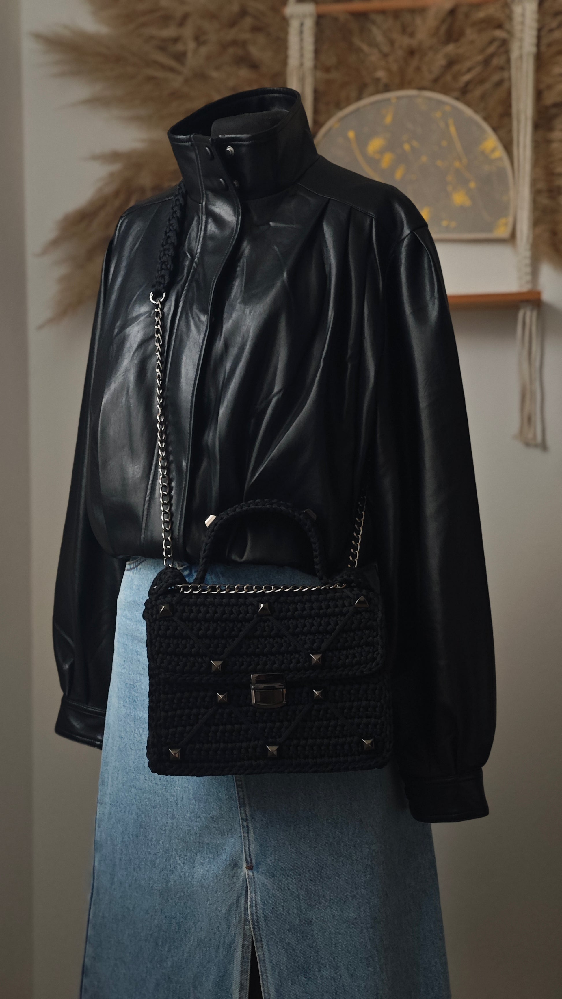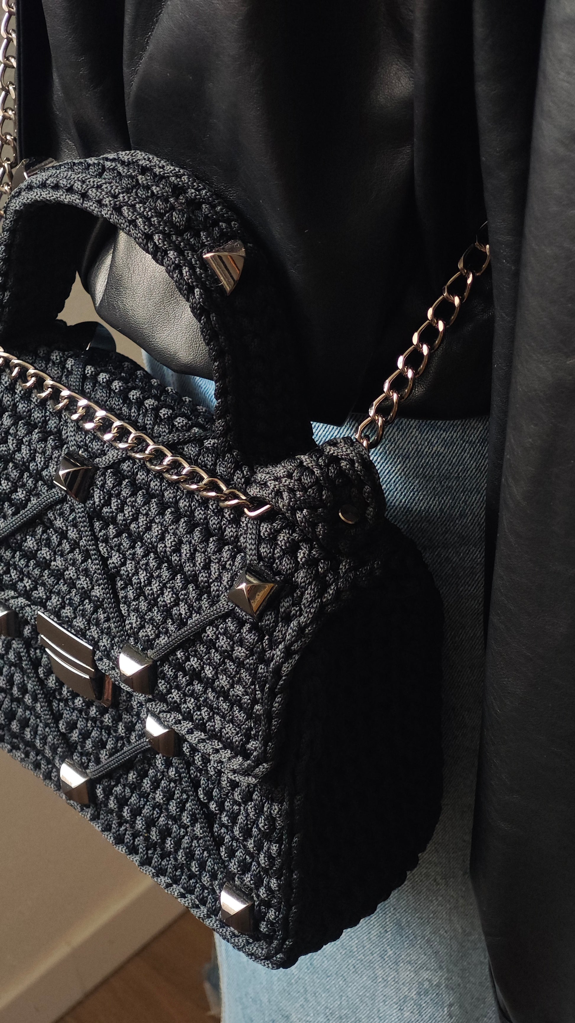Diese außergewöhnliche Handtasche aus schwarzem Polyester-Garn vereint modernes Design mit handgefertigter Präzision. Das einzigartige Häkelmuster wird durch dekorative Querfäden stilvoll ergänzt, während glänzende Nieten einen Hauch von Rock-Chic verleihen. Dank des verstellbaren Trägers kann die Tasche sowohl als Crossbody als auch über die Schulter getragen werden – ein vielseitiger Begleiter für Alltag und besondere Momente. Robust, praktisch und ein absoluter Blickfang!