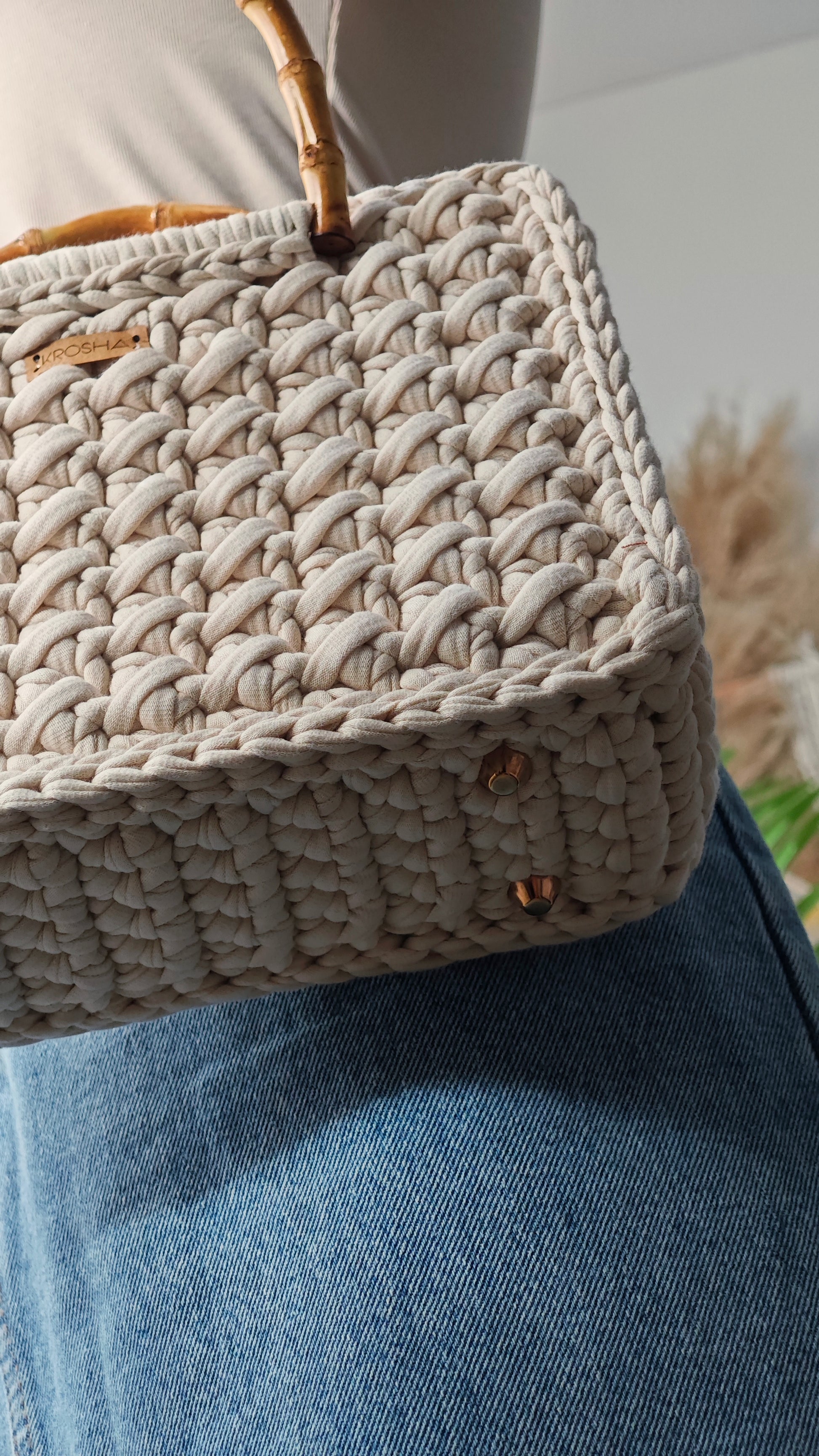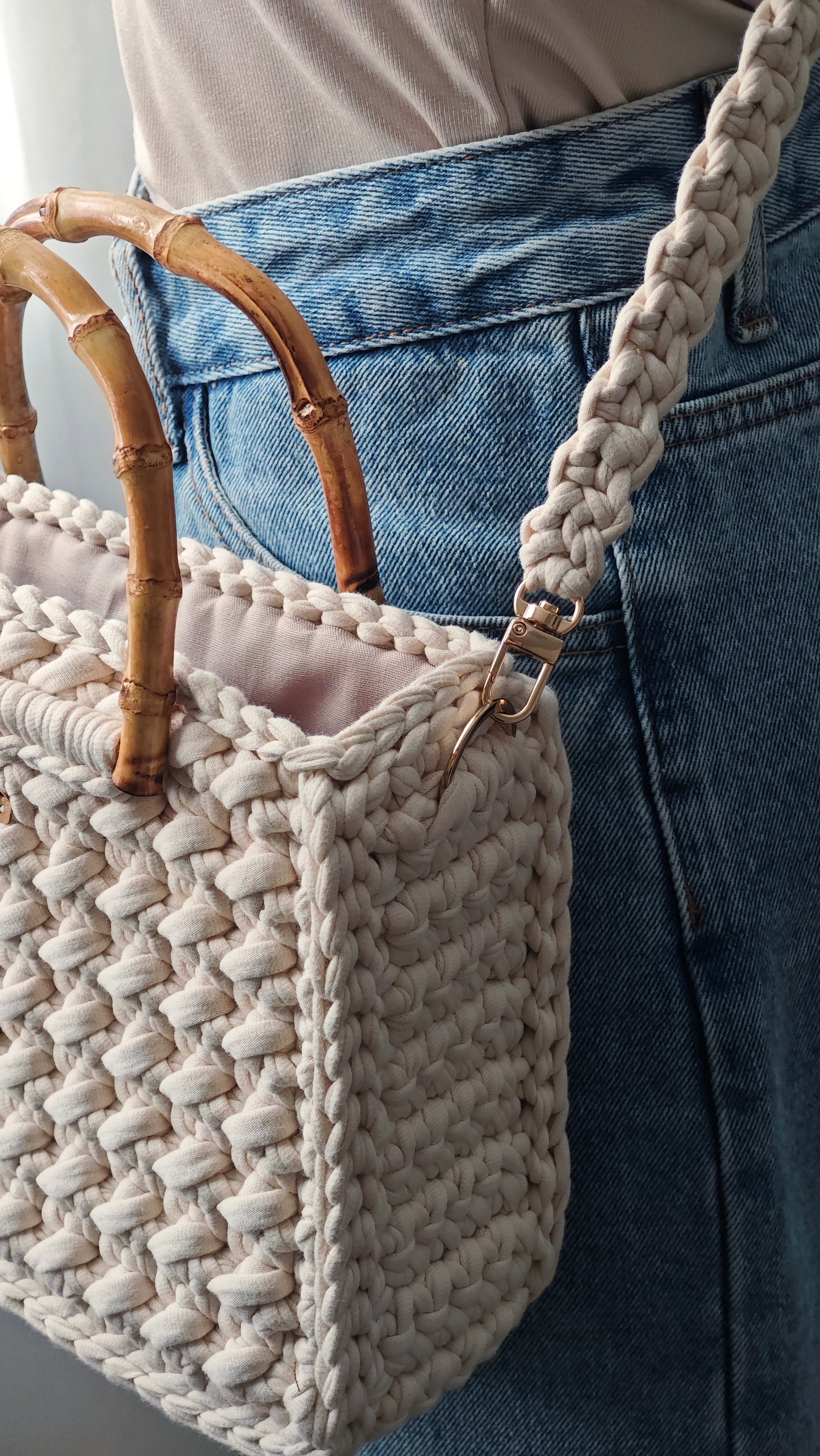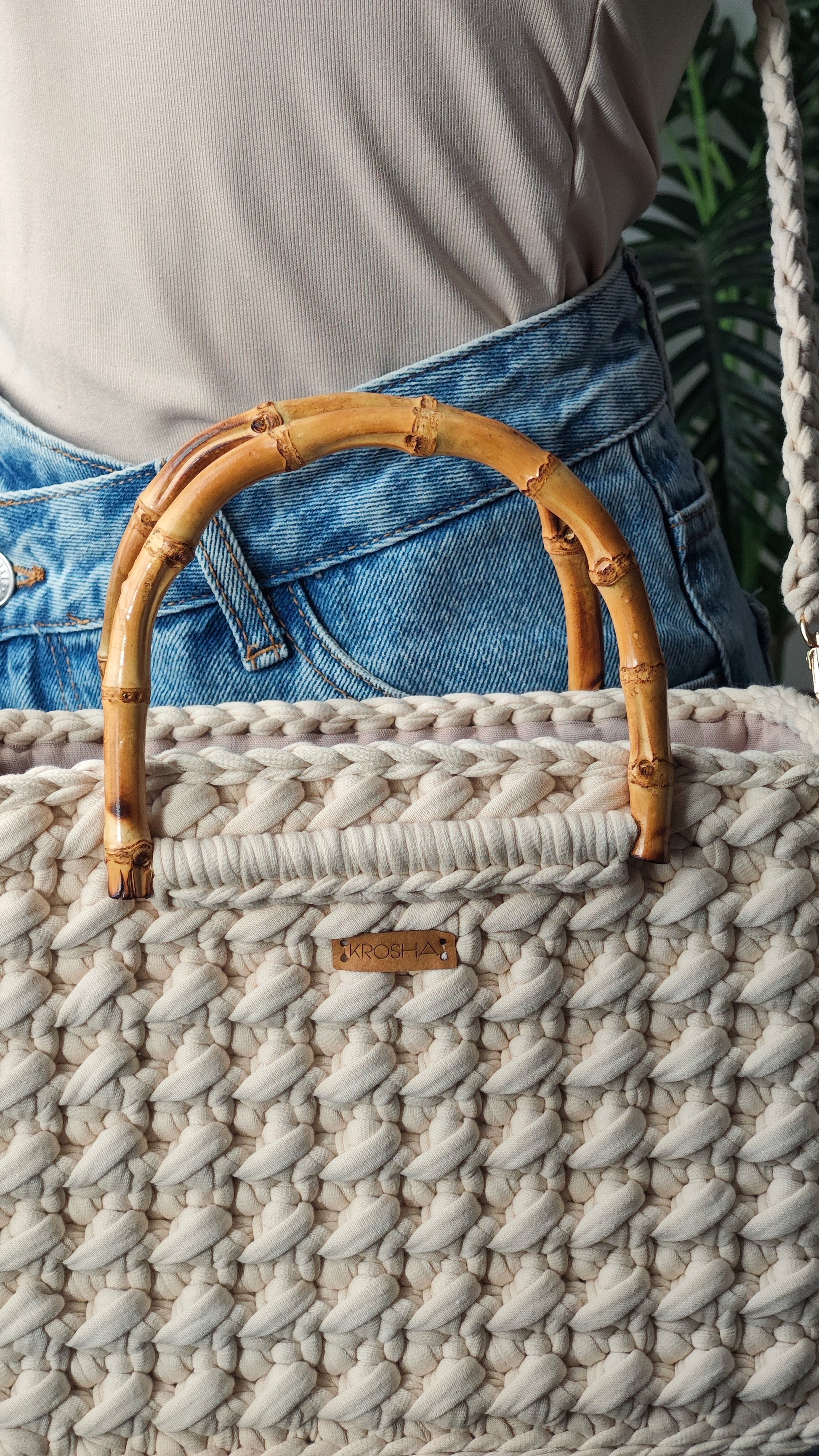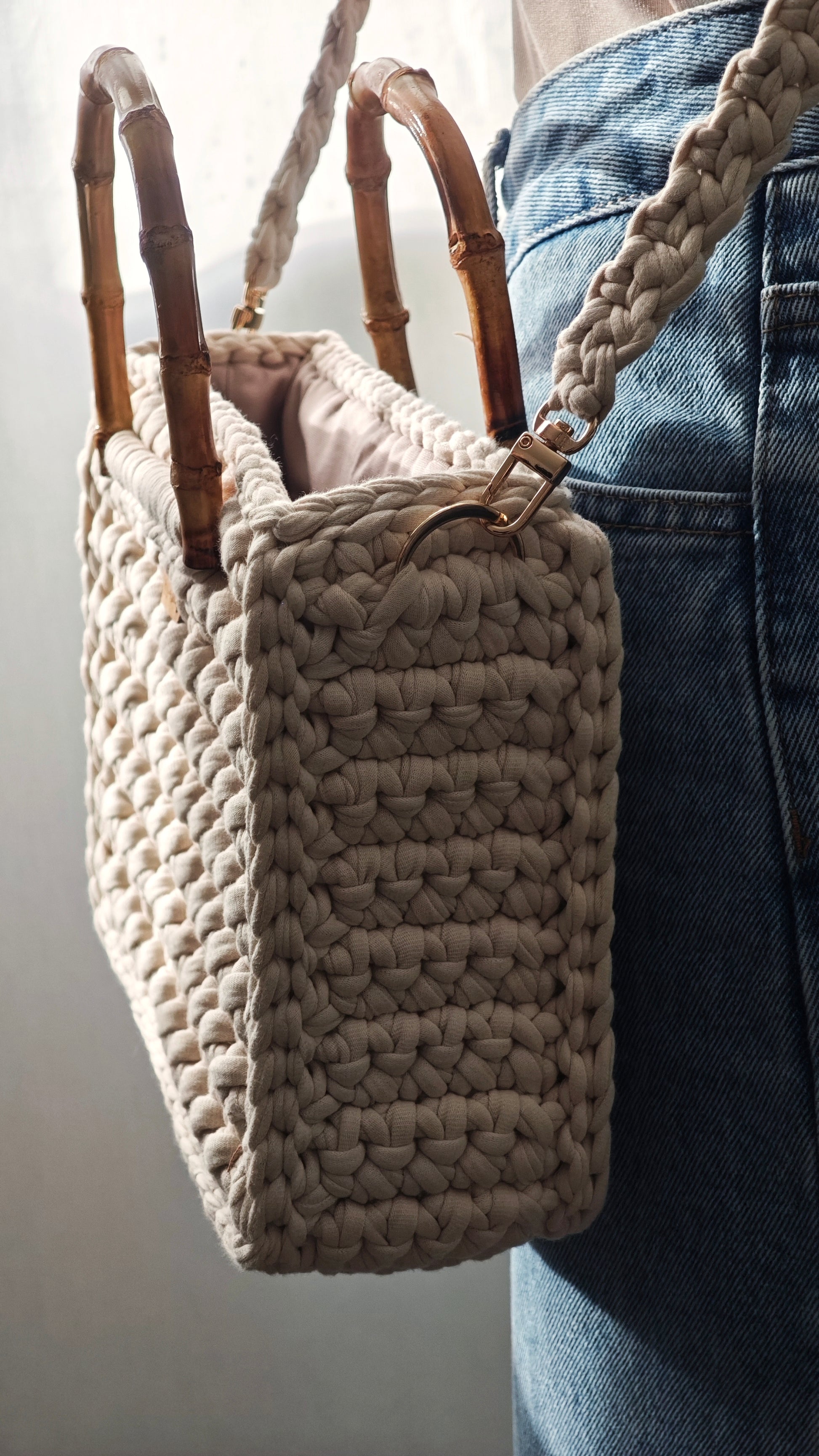 Diese elegante Shopper-Tasche vereint Stil und Funktionalität. Gefertigt aus hochwertigem, hellem Textilgarn überzeugt sie durch ihre schlichte, natürliche Optik. Die Bambusgriffe verleihen ihr einen Hauch von Exotik, während der schmale Crossbody-Gurt vielseitiges Tragen ermöglicht – ob in der Hand oder über der Schulter.