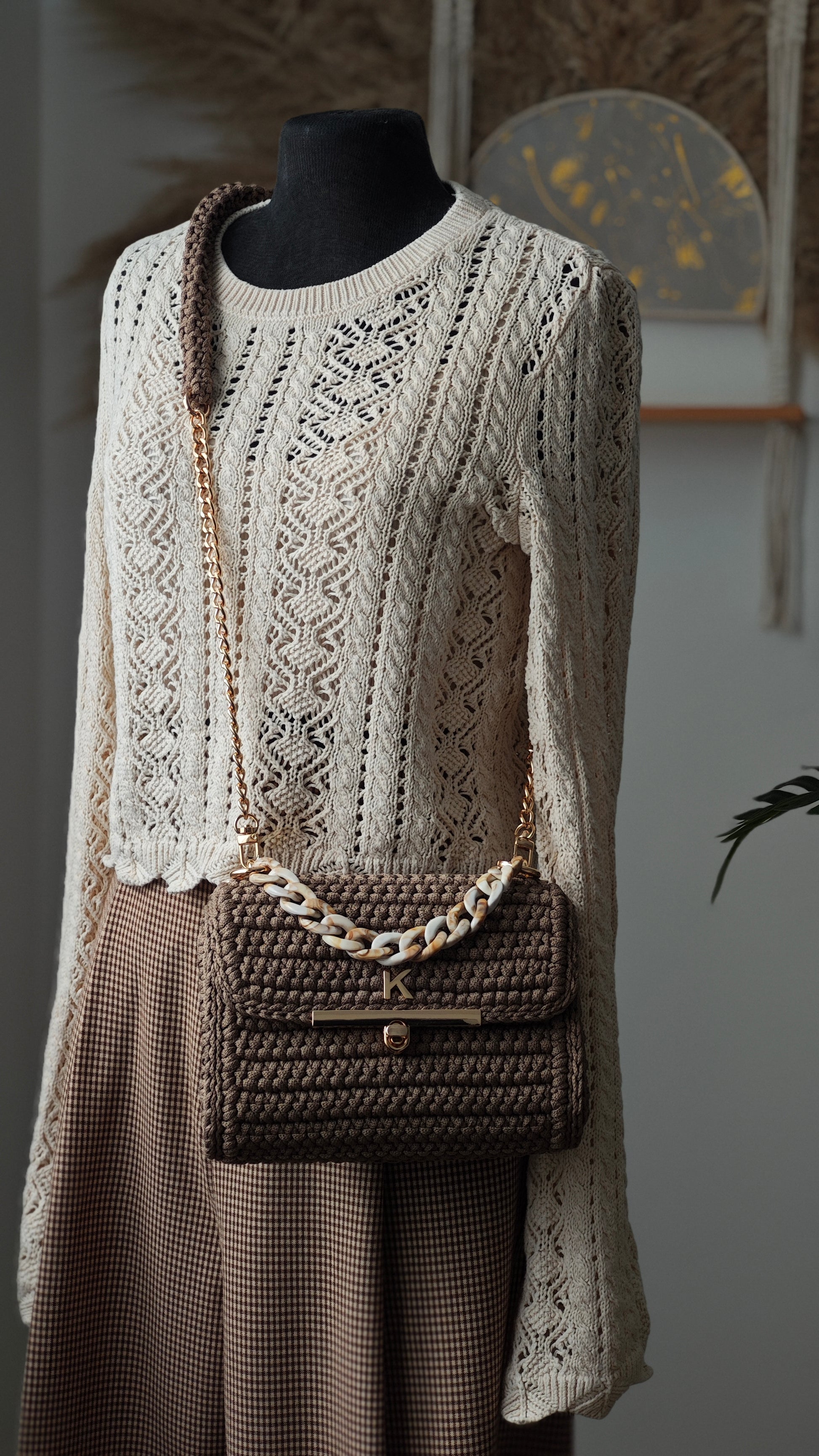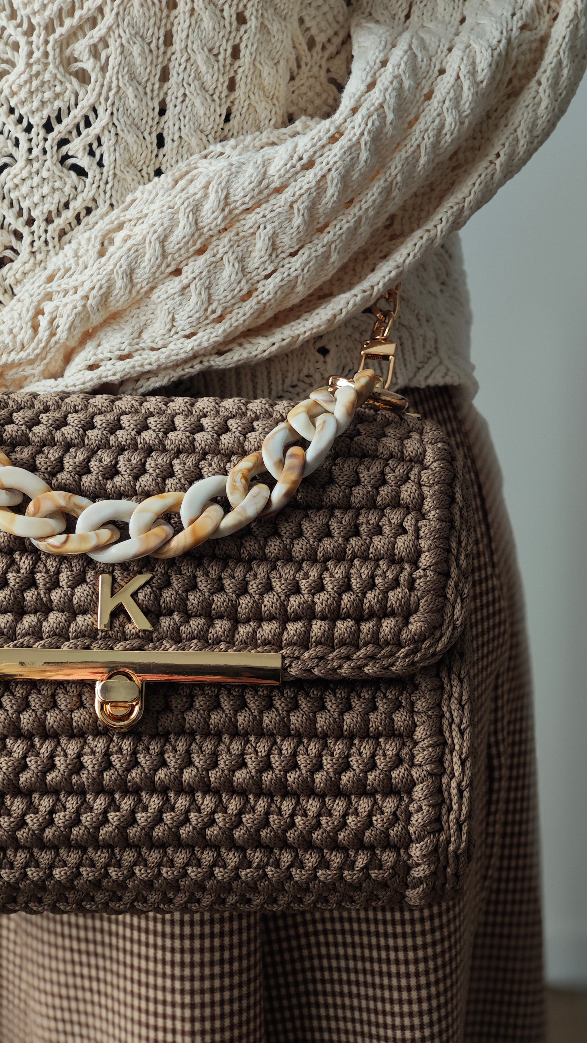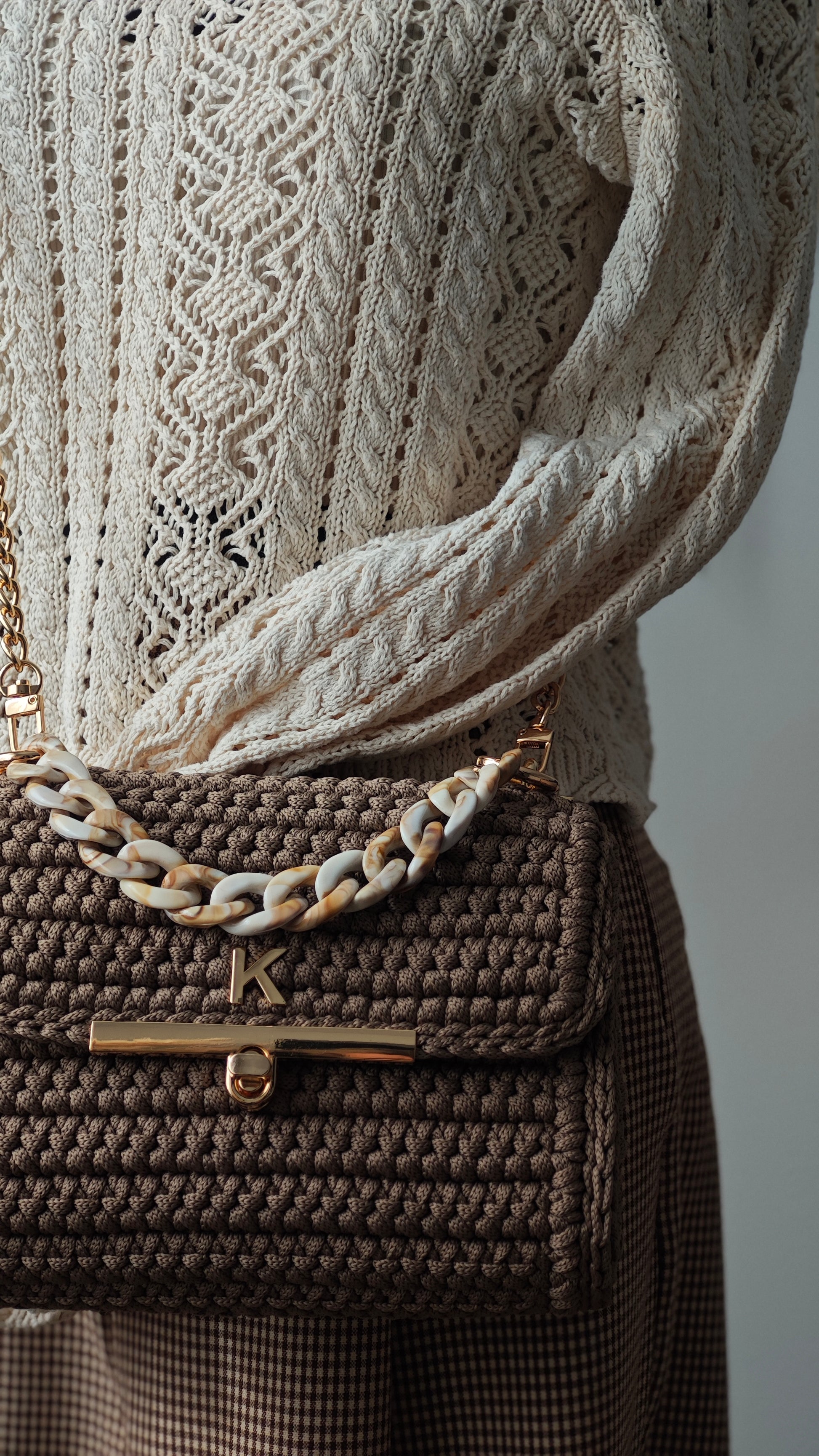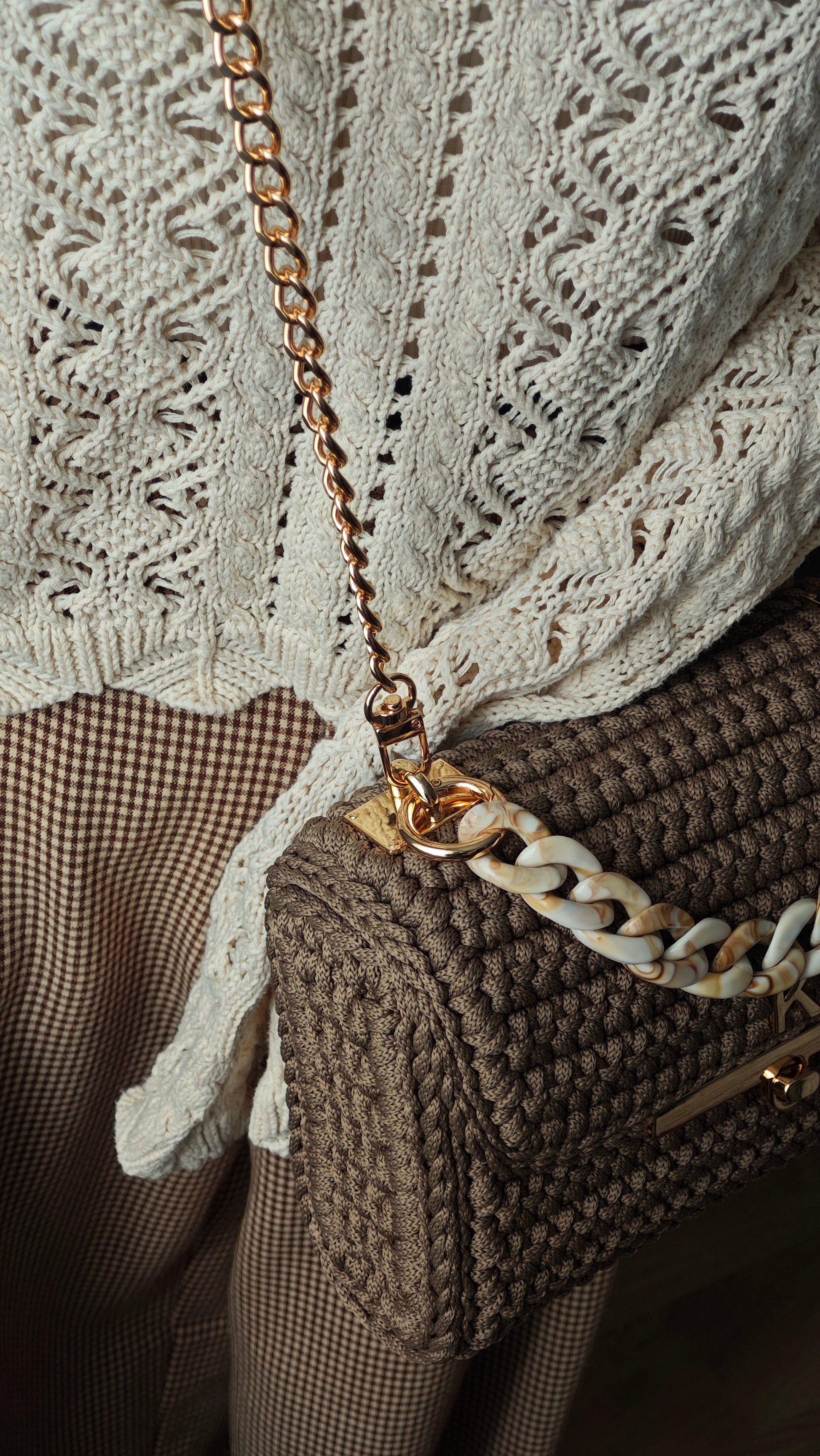 Diese handgefertigte gehäkelte Handtasche aus hochwertigem Polyestergarn vereint Stil und Funktionalität. Trage sie als elegante Clutch oder nutze den abnehmbaren Crossbody-Gurt für mehr Komfort. Die dekorative Kette verleiht einen edlen Touch und kann gleichzeitig als Griff dienen – natürlich ebenfalls abnehmbar.