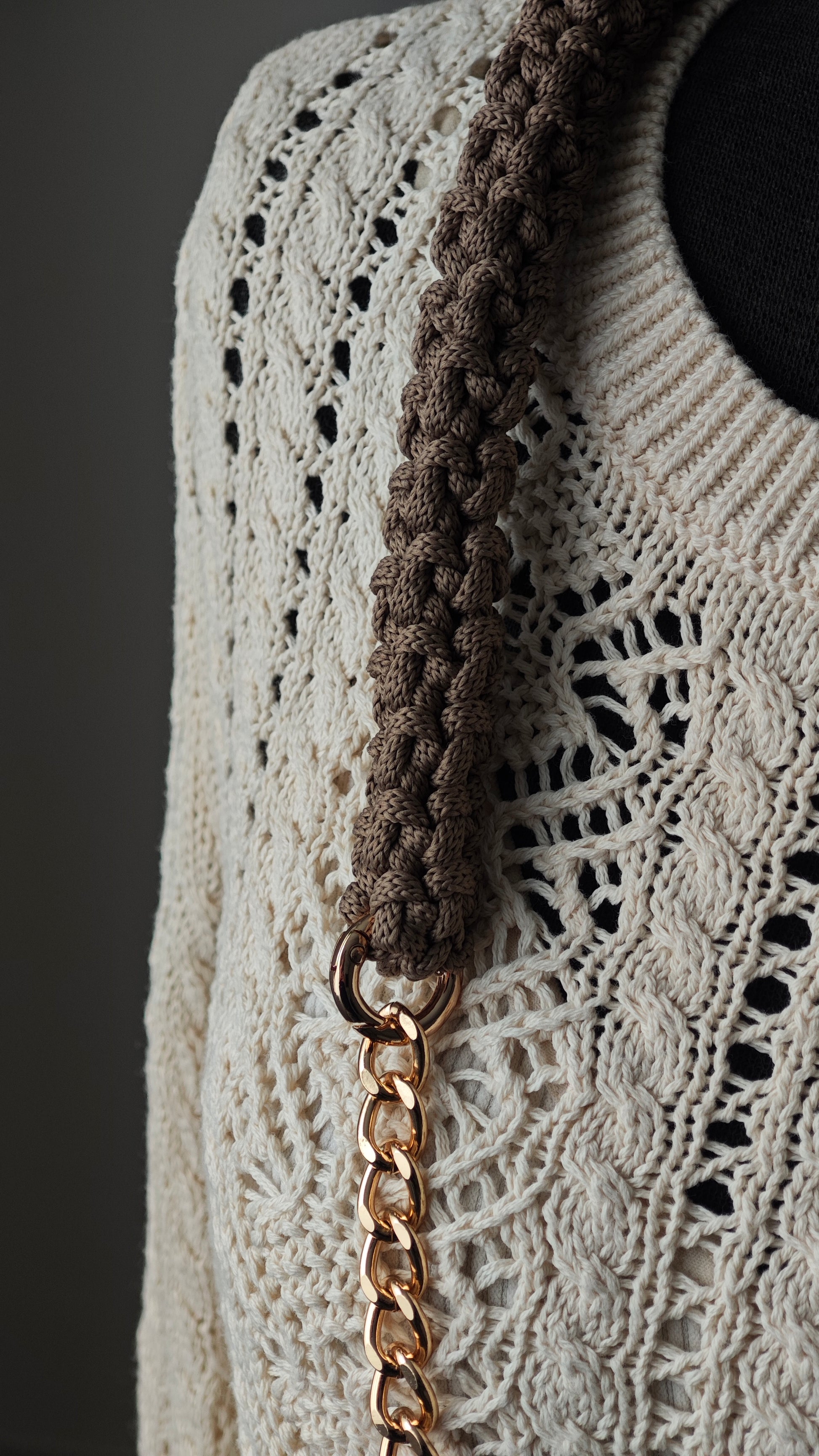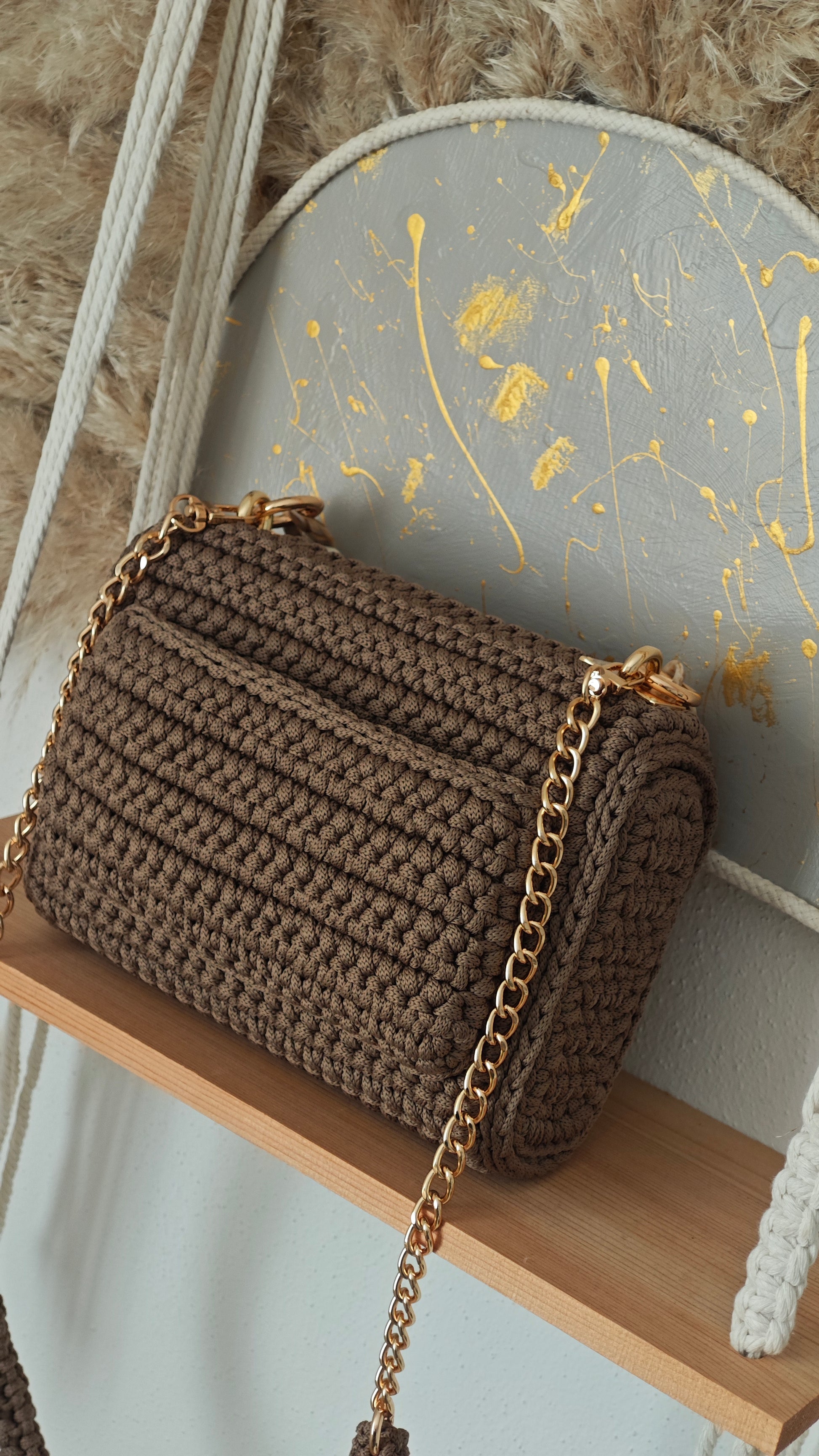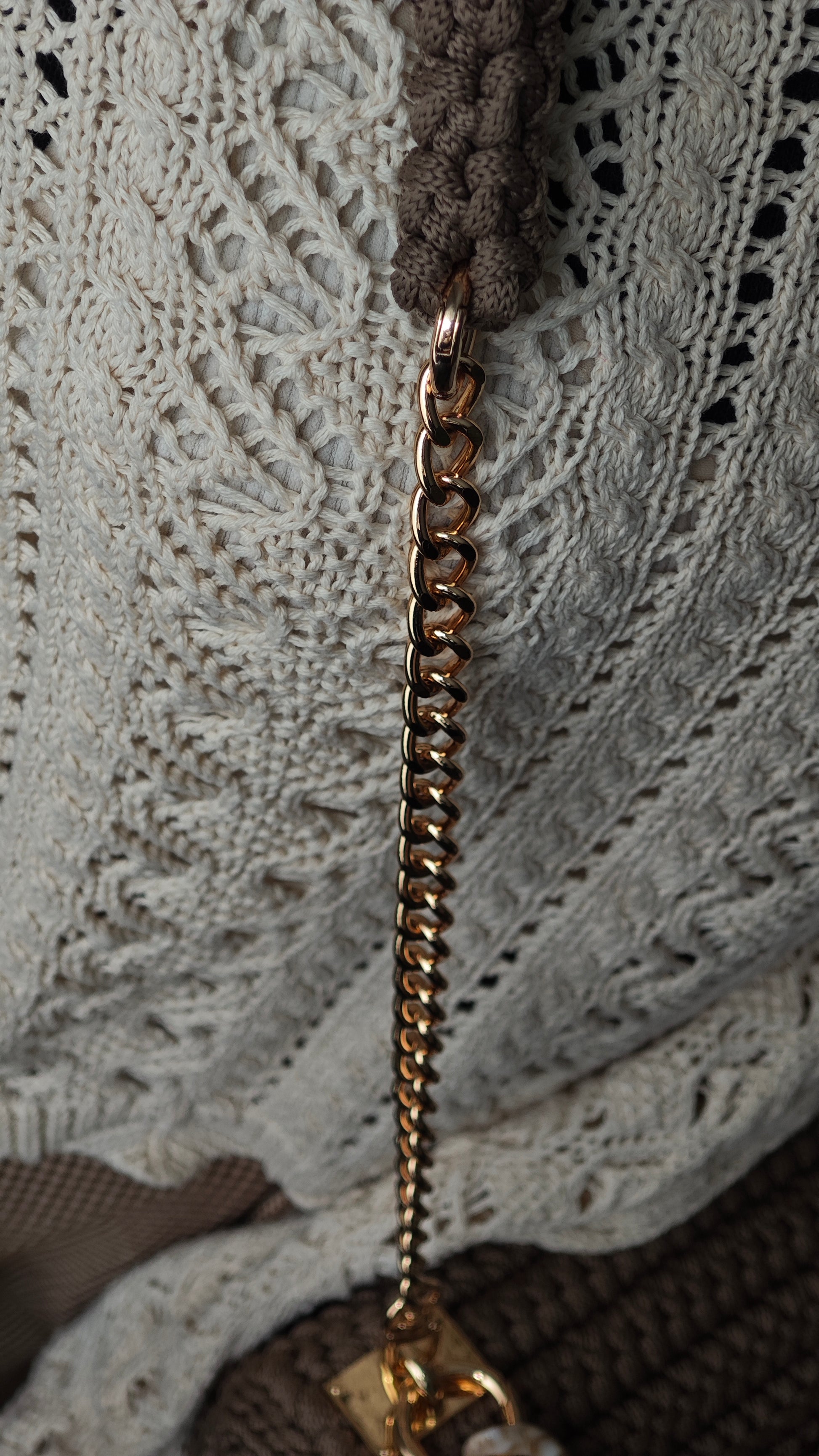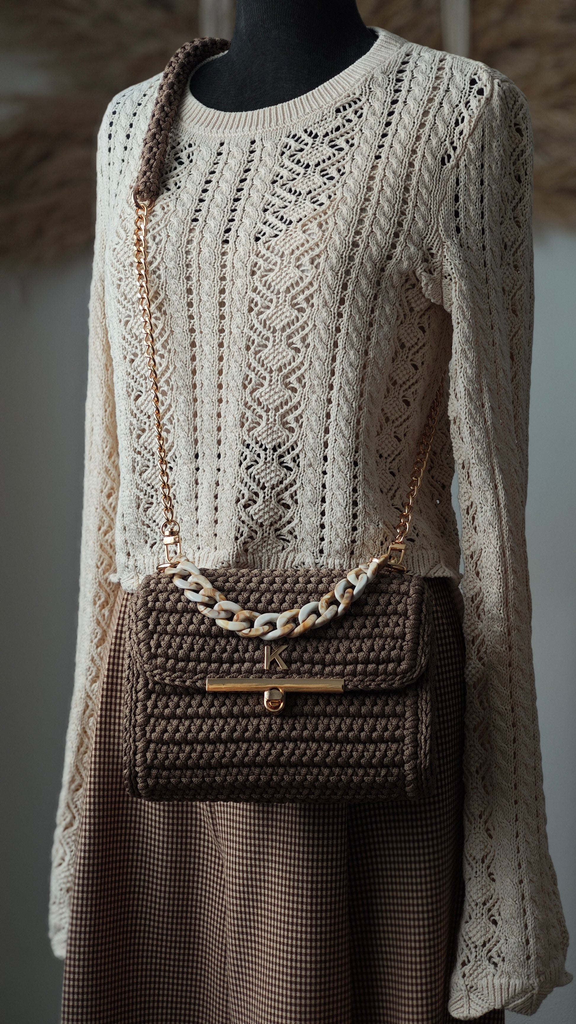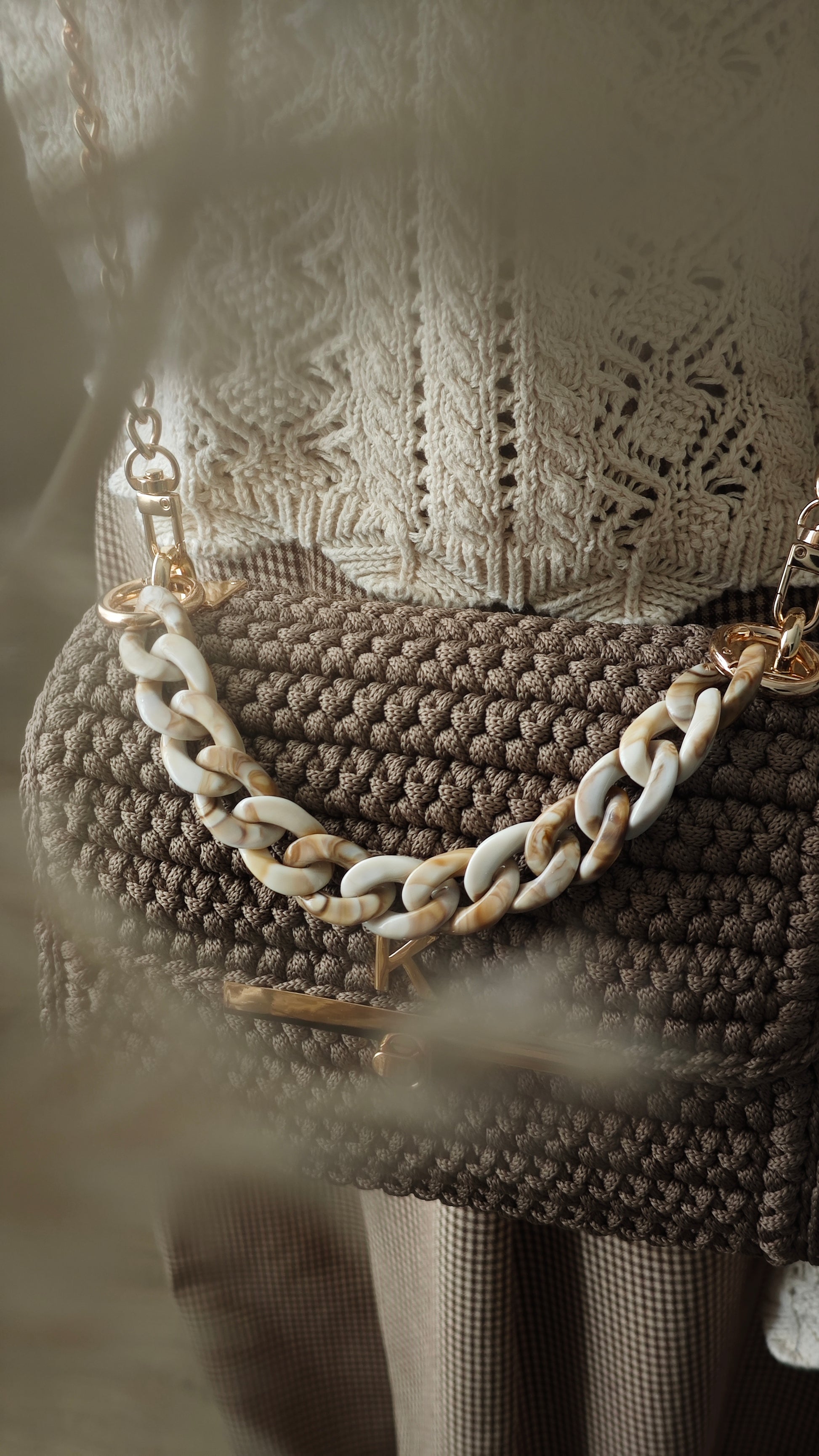 Diese handgefertigte gehäkelte Handtasche aus hochwertigem Polyestergarn vereint Stil und Funktionalität. Trage sie als elegante Clutch oder nutze den abnehmbaren Crossbody-Gurt für mehr Komfort. Die dekorative Kette verleiht einen edlen Touch und kann gleichzeitig als Griff dienen – natürlich ebenfalls abnehmbar.